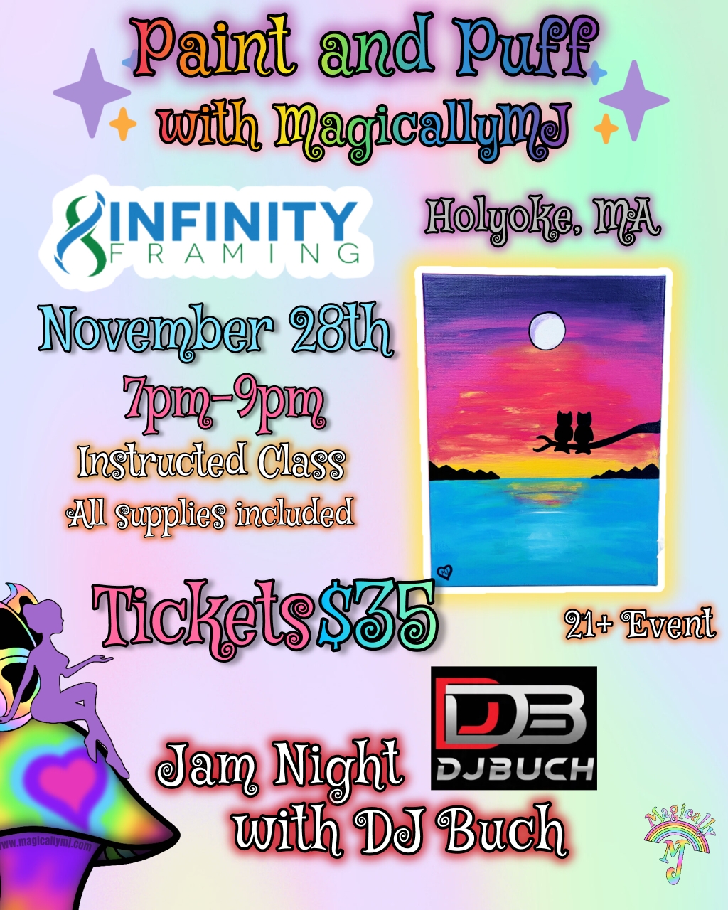 We have an exciting night planned for Infinity Framing in Holyoke! Join us for a fun-filled evening of creativity and relaxation at this amazing venue! Unleash your inner artist while enjoying the cozy atmosphere and amazing music of DJ Buch (https://www.tiktok.com/@djbuch1?§r=1&§t=ZP-919JZJeTF9y).
